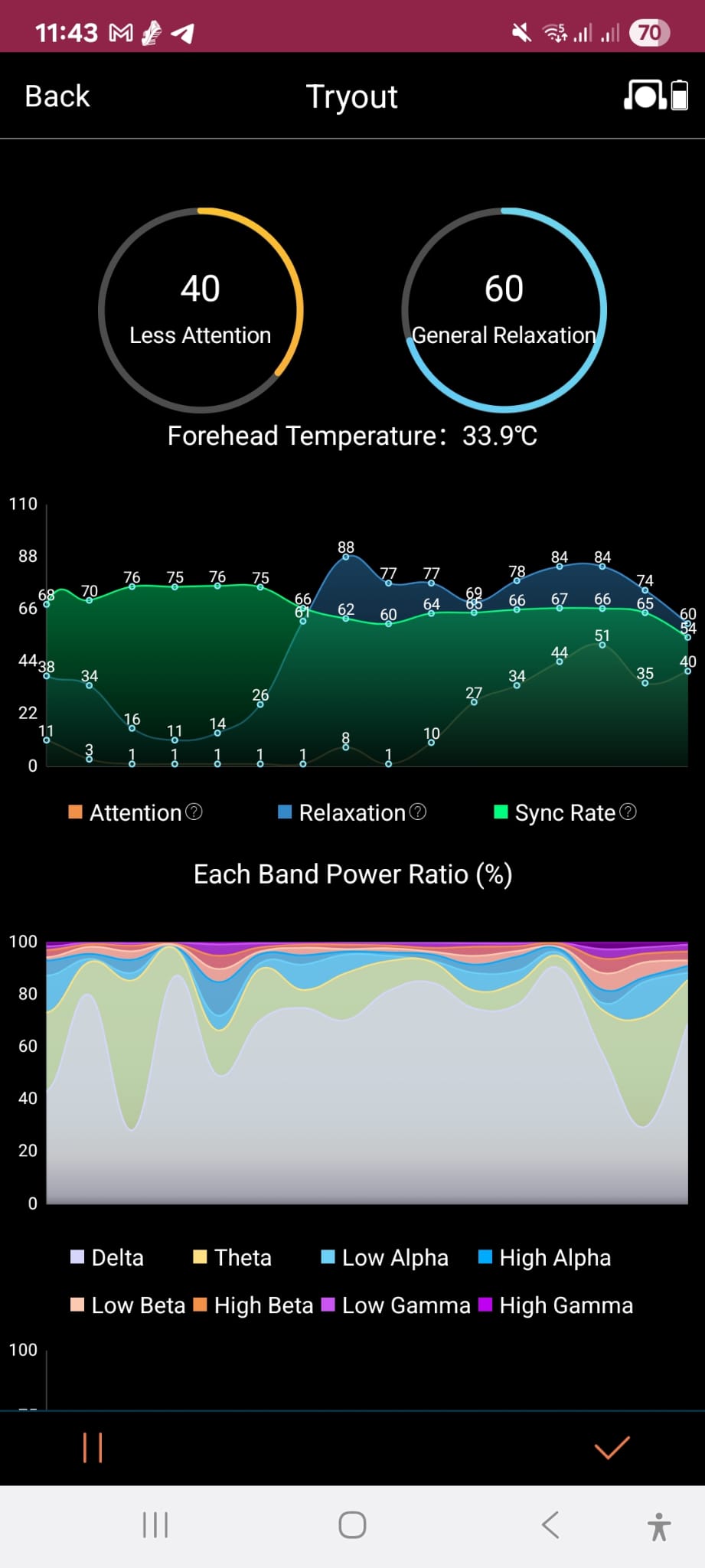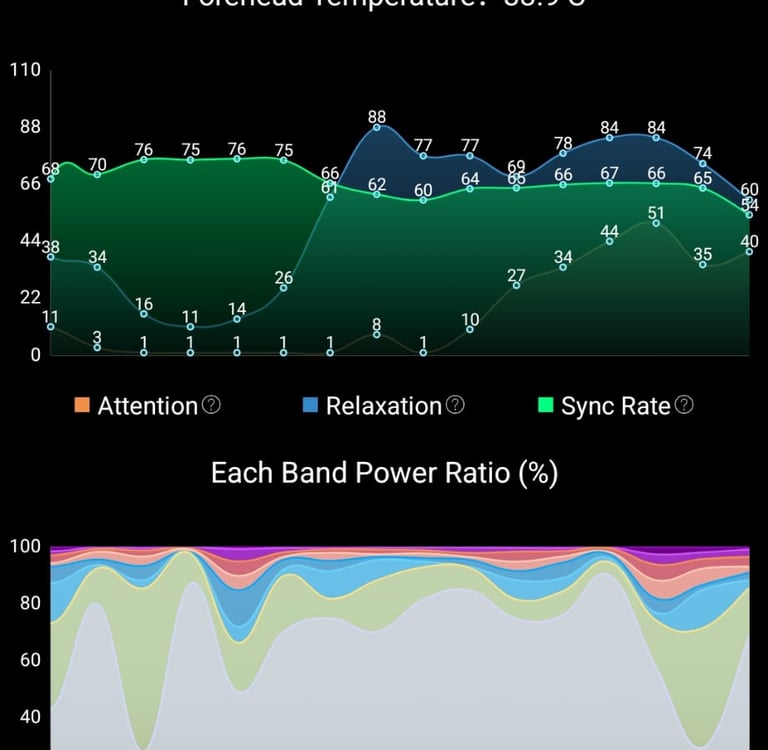 Durante la sesión, las ondas mostraron una coherencia notable: el cerebro no solo se relajó, sino que entró en un estado armónico de flujo, propio de experiencias meditativas y expansivas.